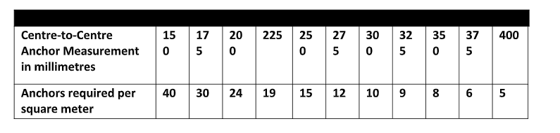 measurement. The table as shown below gives the quantity of anchors required per square meter for various